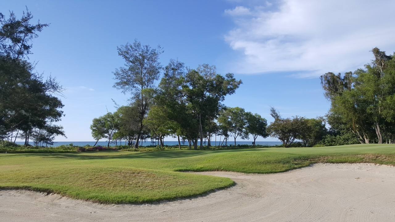 ๋ค๋ฐ๋ฅด๋ 13๋ฒํ(ํ5)๋ ๋ง๋ง์น ์๋ค. ํฐ์ท์ผ๋ก ๊ทธ๋ฆฐ ์์ ์ปค๋ค๋ ์ฐ๋ชป์ ํ์ฉ ๋๊ฒจ๋ฒ๋ฆด ์ค๋ ฅ์ด ์ ๋๋ฉด ์ฐ๋ชป ์ค๋ฅธ์ชฝ ํ์ด์จ์ด๋ก ์ณ๋ด์ ์ฐํํด์ผ ํ๋๋ฐ, ์ด์ชฝ ํ์ด์จ์ด๊ฐ ๋ฆฌ๋ณธ ๋ชจ์์ผ๋ก ์์ฃผ ์ข์ ๋ฐ๋ค ํ์ด์จ์ด ์ค๋ฅธ์ชฝ์๋ ์ํฐํด์ ๋๊ฐ ์๊ณ ๊ทธ๋ฆฐ๊ณผ์ ์ฌ์ด์๋ ํญ์ด 90m๋ ๋๋ ๋ฒ์ปค๊ฐ ๋ฒํฐ๊ณ ์๋ค. ๊ณจํ์ฅ ๊ด๊ณ์๋ “๋ฐ๋ค ์ชฝ์ผ๋ก ์ญ์ญ ์์์ค๋ฅธ ์ฅ๋ํ ์๋ชฉ๋ค์ ํ๋ํ์ง ๋ง๊ณ ์ค๋ก์ง ๊ฒ์์๋ง ์ง์คํด์ผ ๋ณผ์ ๊ทธ๋ฆฐ์ ์ฌ๋ฆด ์ ์๋ค”๋ฉฐ ๋์ ์ฐก๊ธํ๋ค.