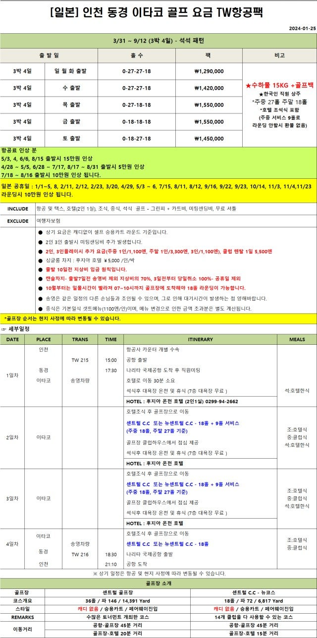 포함사항 : 항공 및 택스, 호텔 2인1실, 조중석식, 그린피 + 카트, 미팅 센딩비