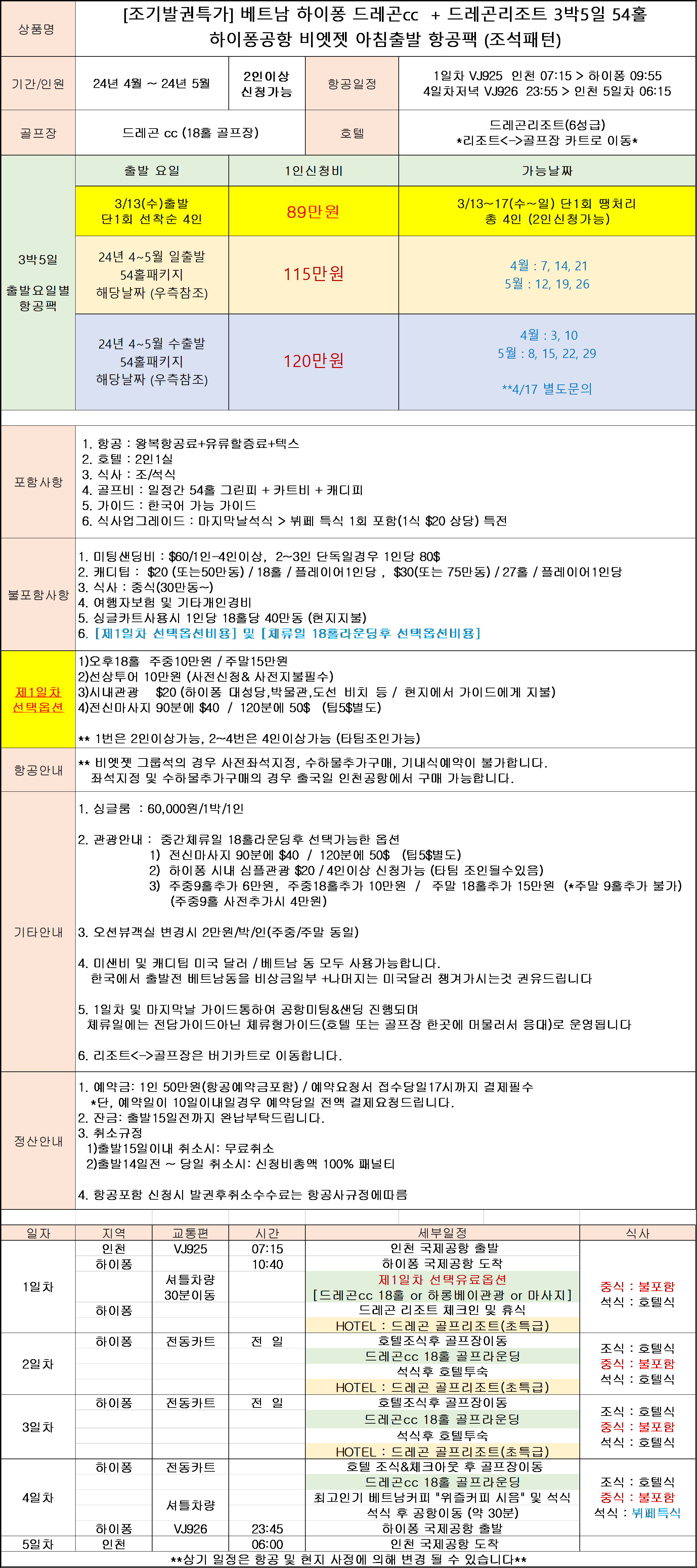 🔔✈하이퐁드레곤cc 비엣젯 항공팩 3박5일 54홀 항공팩 🔔