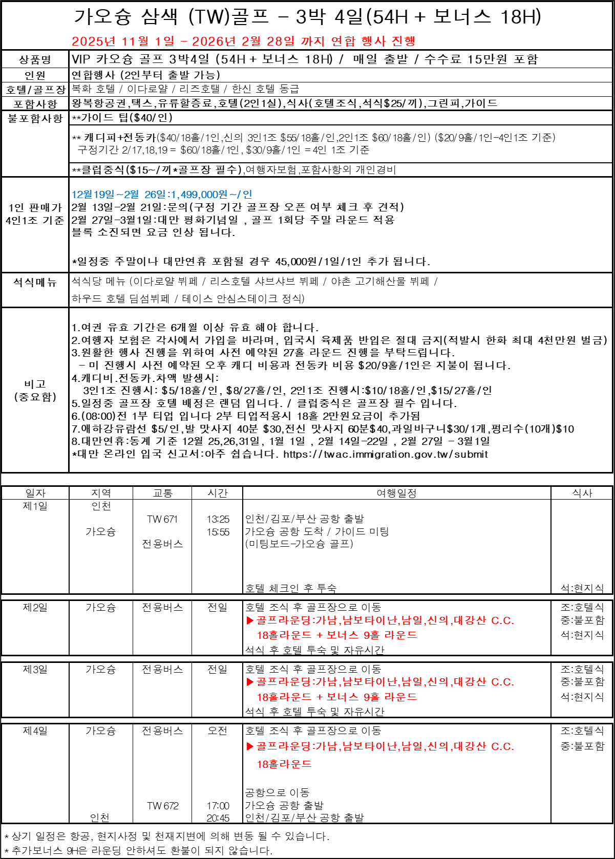 2025년~26년 겨울시즌 가오슝 특별기획 VIP 3색 이벤트 골프행사를 진행하게 되었습니다.