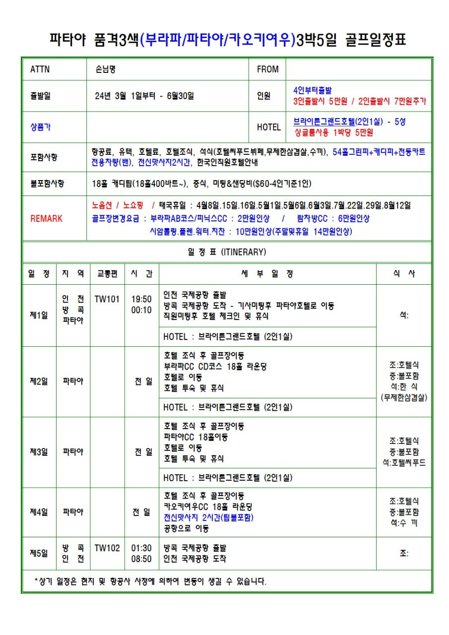 ⭕파타야 품격3색골프 3박5일⭕