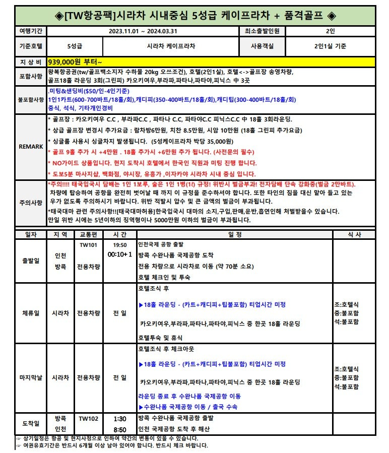 ✔ 캐디피: 각각 1인/18홀 기준 350 ~ 400바트