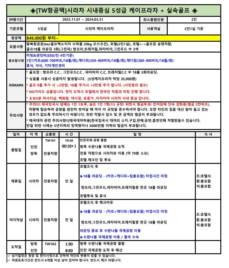 ✔ 카트비: 각각 1인 /18홀 기준 600 ~ 700바트
