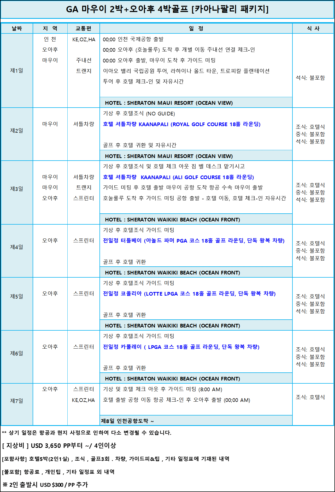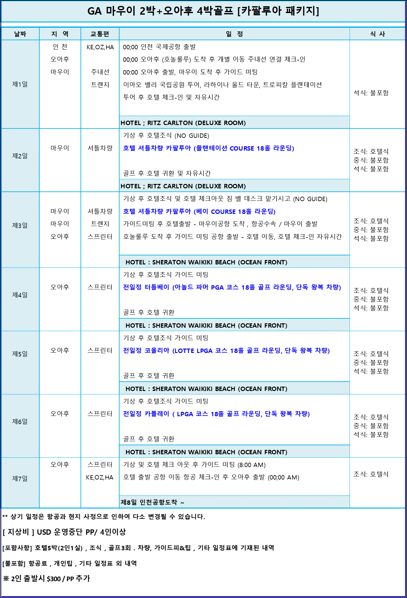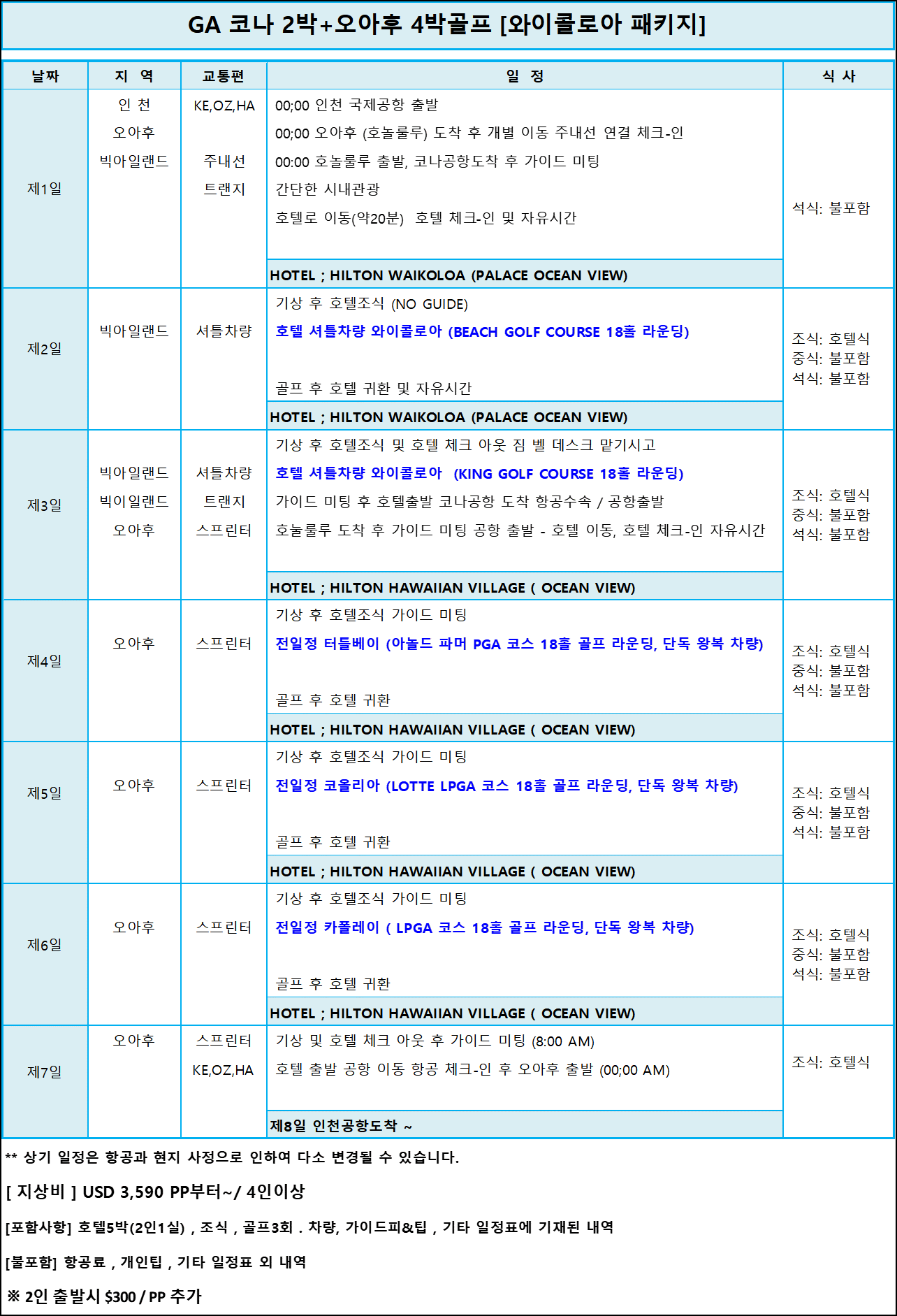 ▶4, 코나 2박 + 오아후4박 8일골프 (와이콜로아 코스)