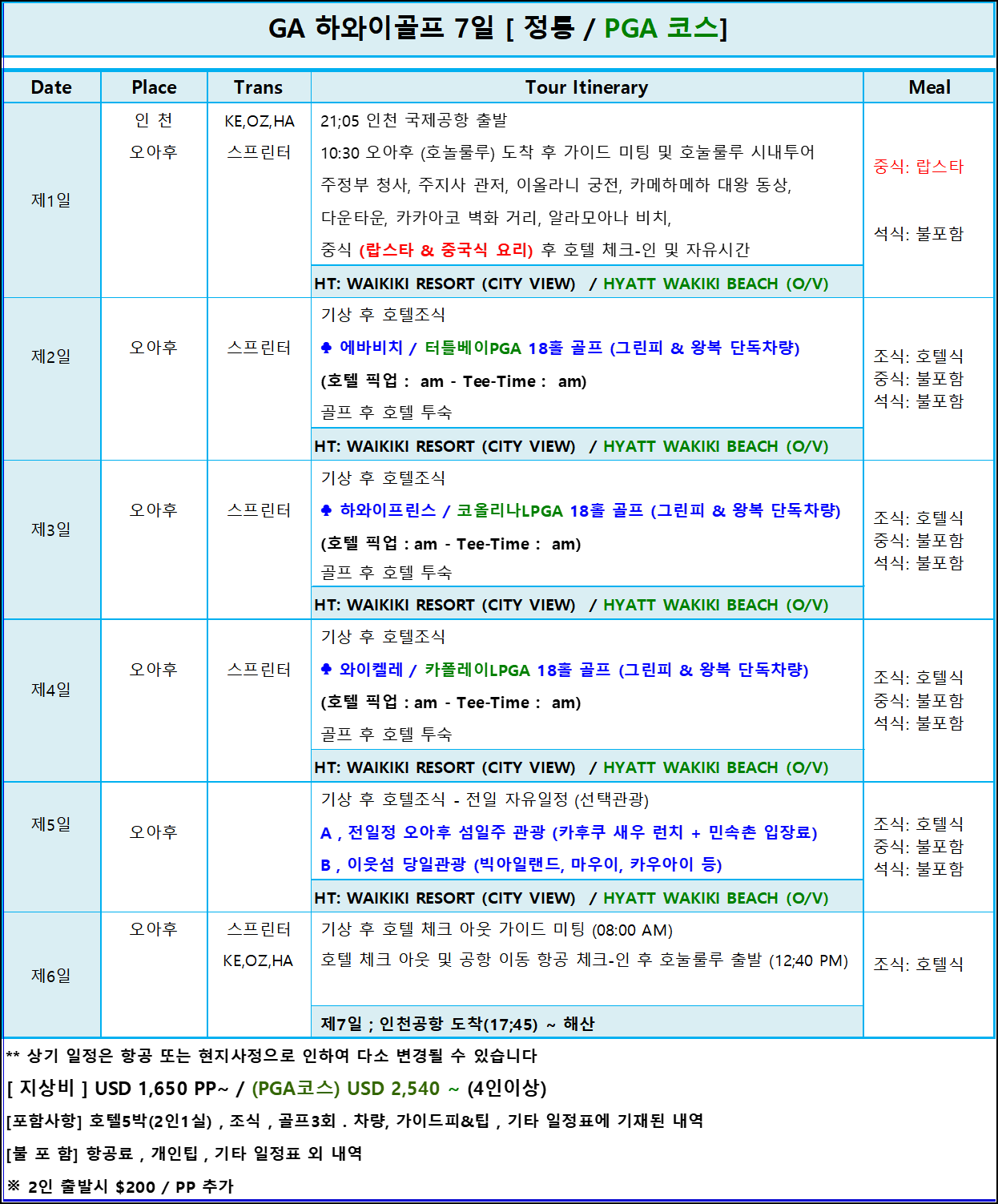 ▶1,오아후 골프 5박7일 (정통 / PGA코스)
