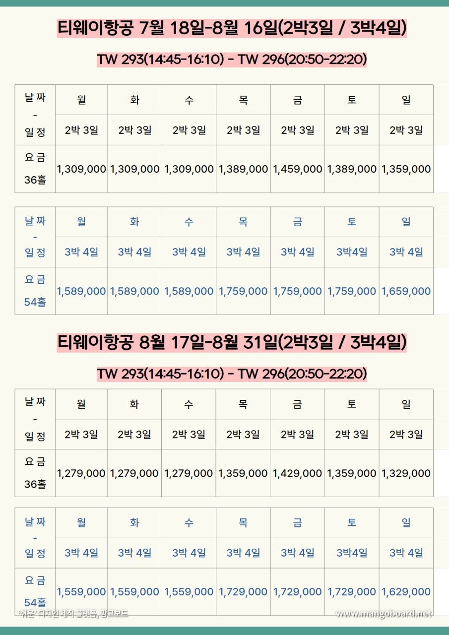 ✈️티웨이항공 3월31일~8월31일(2박 & 3박)요금입니다.