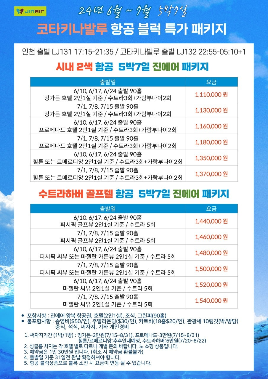 *포함사항 : 진에어 왕복 항공권, 호텔(2인1실), 조식, 그린피(90홀)