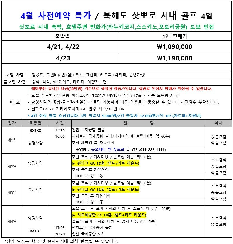 👍 4~5월 삿포로 시내 골프 4일(54홀) 1,090,000원부터~👍