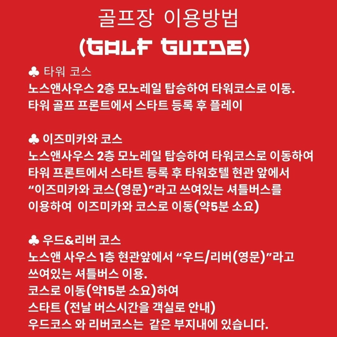 4개의 골프장(타워코스, 우드코스, 리버코스, 이즈미카와 코스)를 보유하고 있으며 타워, 노스, 사우스 3개의 숙박시설이 있습니다.