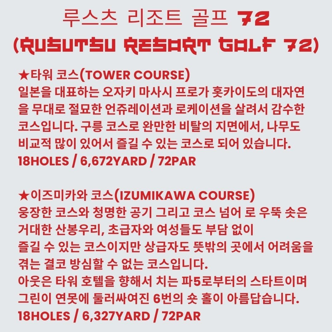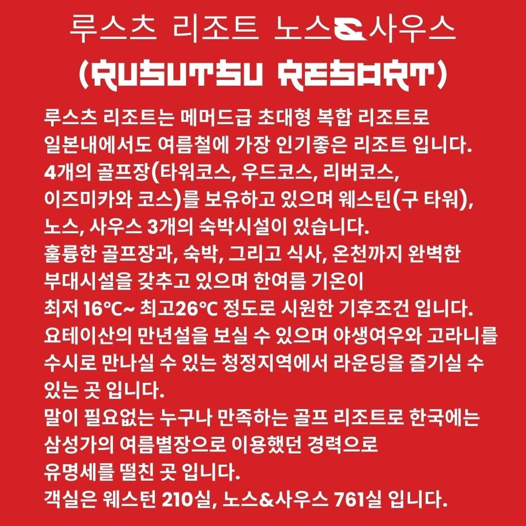 루스츠 리조트 홋카이도 일본홋카이도 최대의 올 시즌 리조트. 여름에는 울창한 대자연에서 야외, 겨울에는 3 개의 산으로 이루어진 총 37 코스에서 스키와 스노우 보드를 즐길 수 있습니다. 호텔에서는 온천과 음식에서 즐기십시오.rusutsu.com