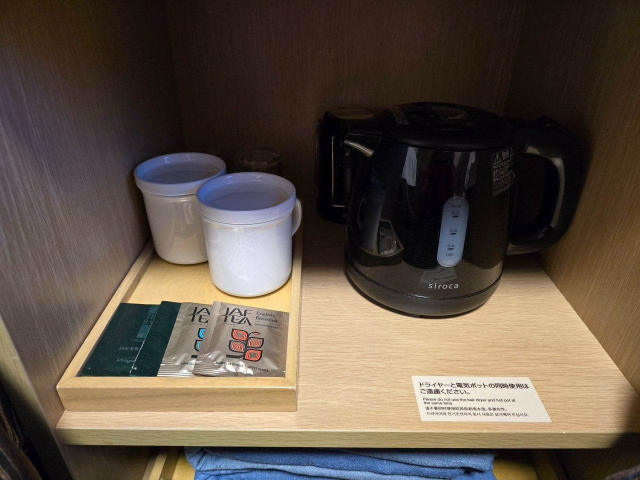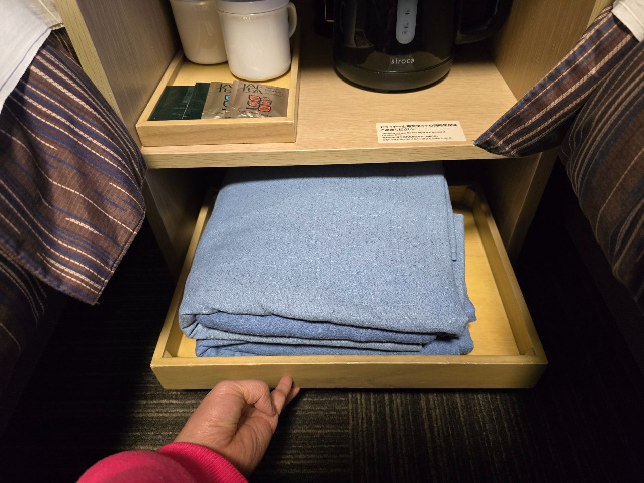 침대 옆에는 커피포트, 차, 컵등이 있고 잠옷도 있습니다. 생수는 별도로 지급하지 않고 수돗물을 그냥 마셔도 됩니다