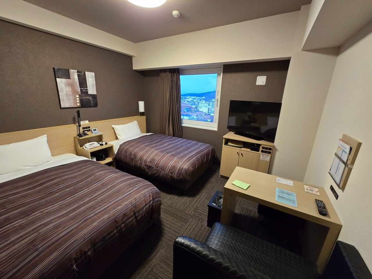트윈룸 이에요~ 침대2개와 2인이 앉을수 있는 의자와 테이블도 준비되어 있어요~