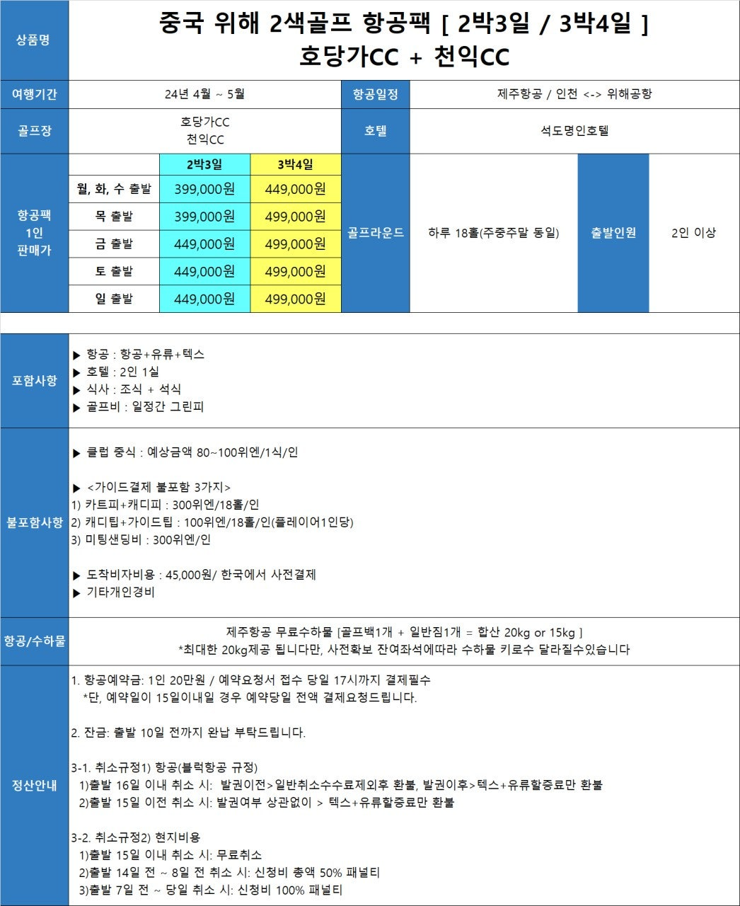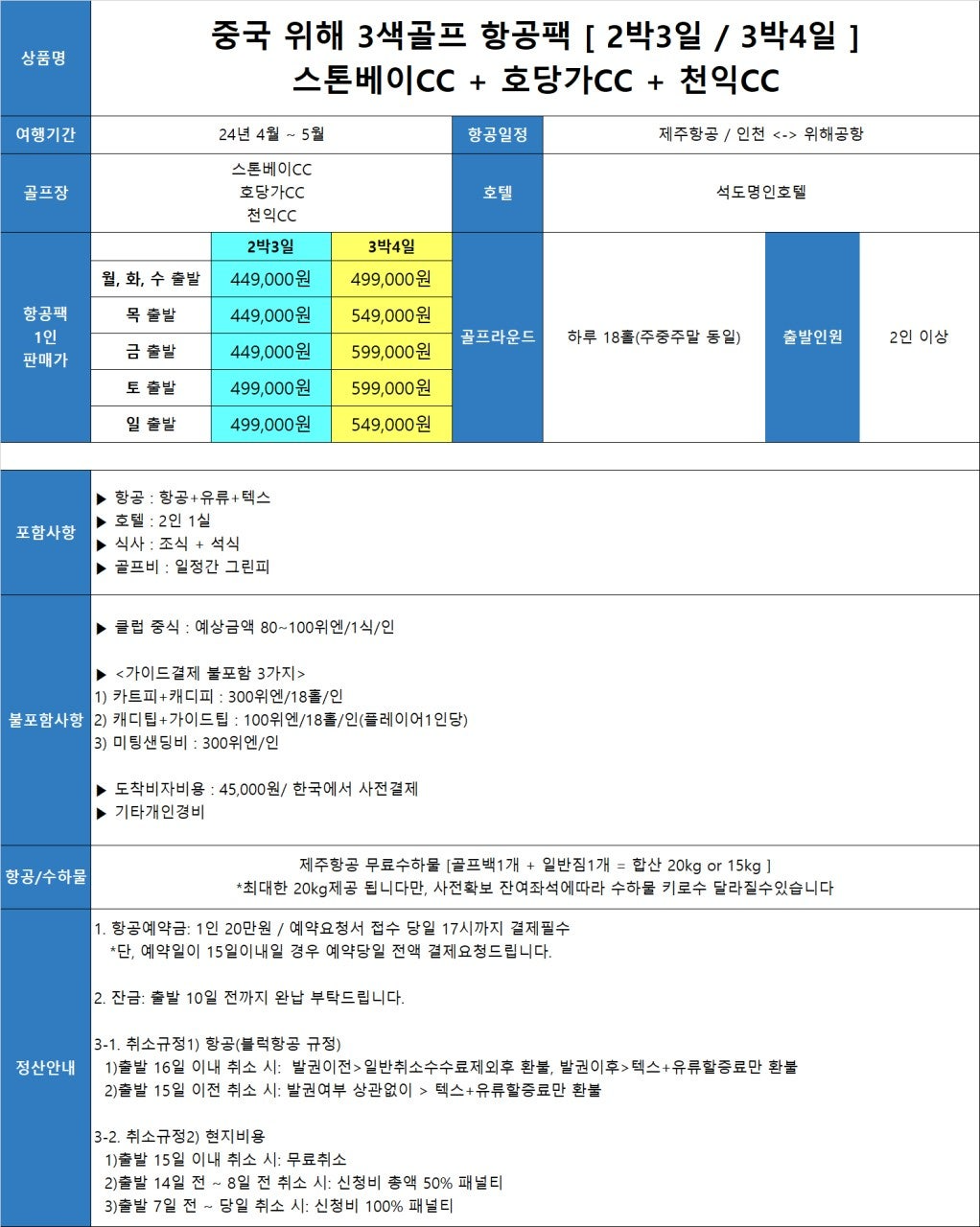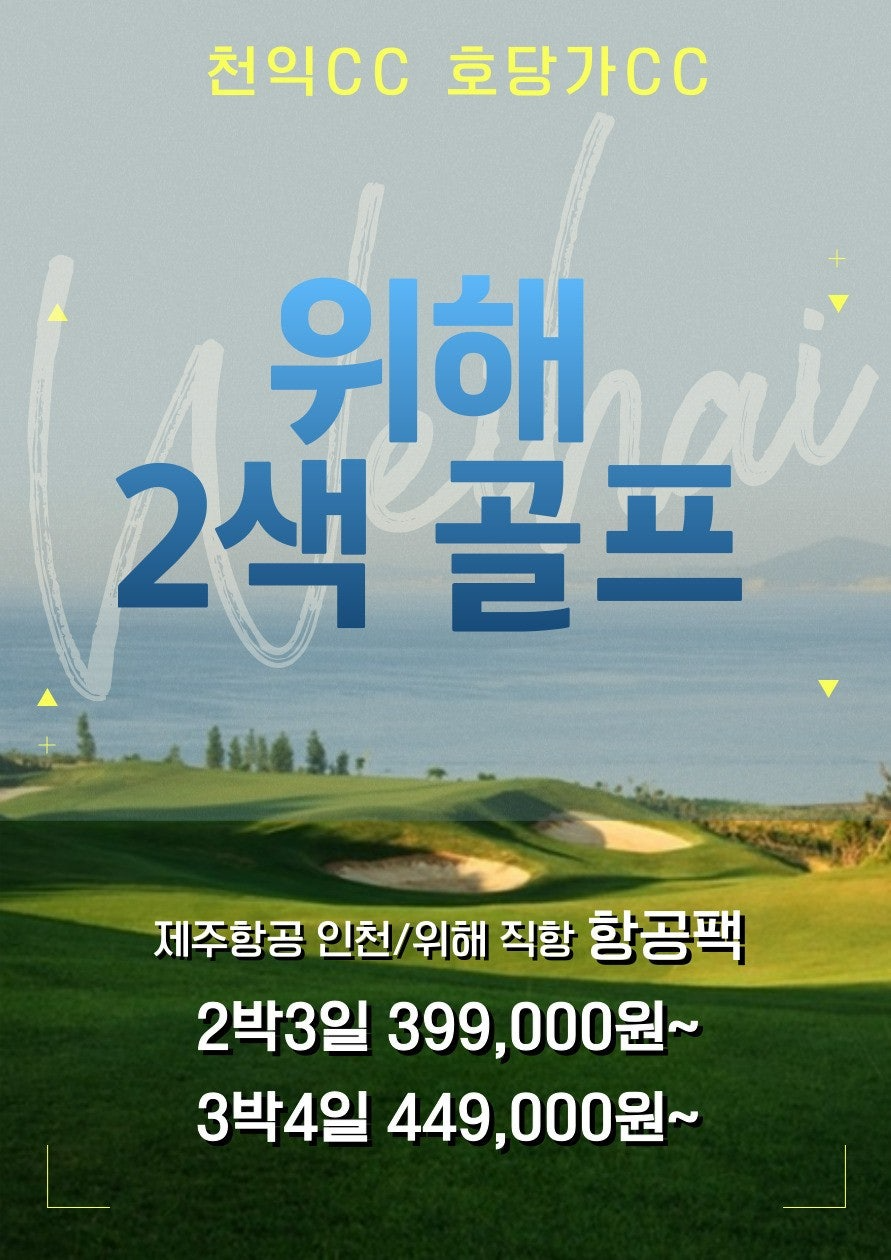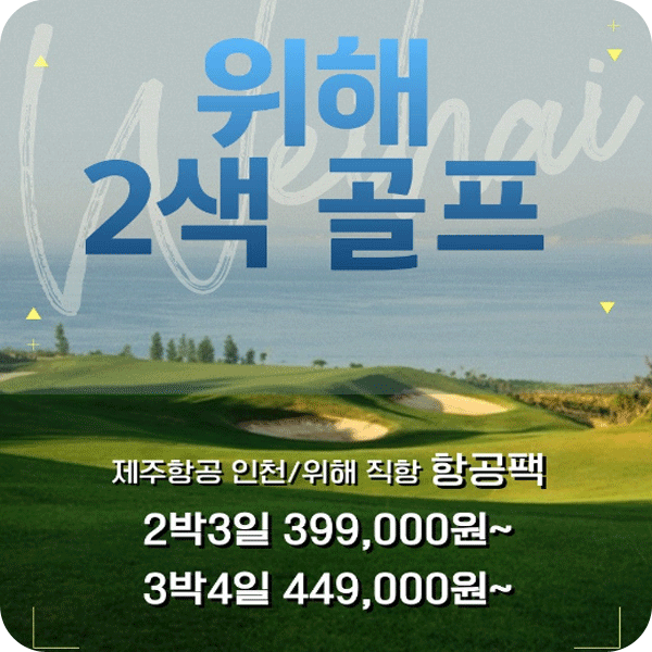 🔔 중국위해골프 제주항공팩 1인 399,000원부터~ 실속2색, 품격3색, 럭셔리3색 / 2박,3박 🔔