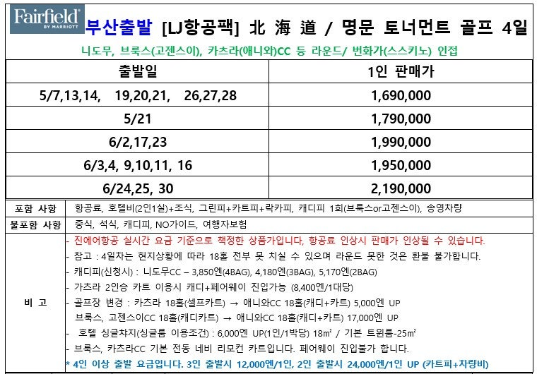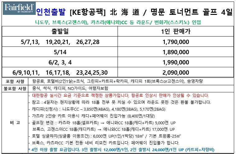 Korean Air + Marriot Hotel + 북해도 최상급 명문코스 를