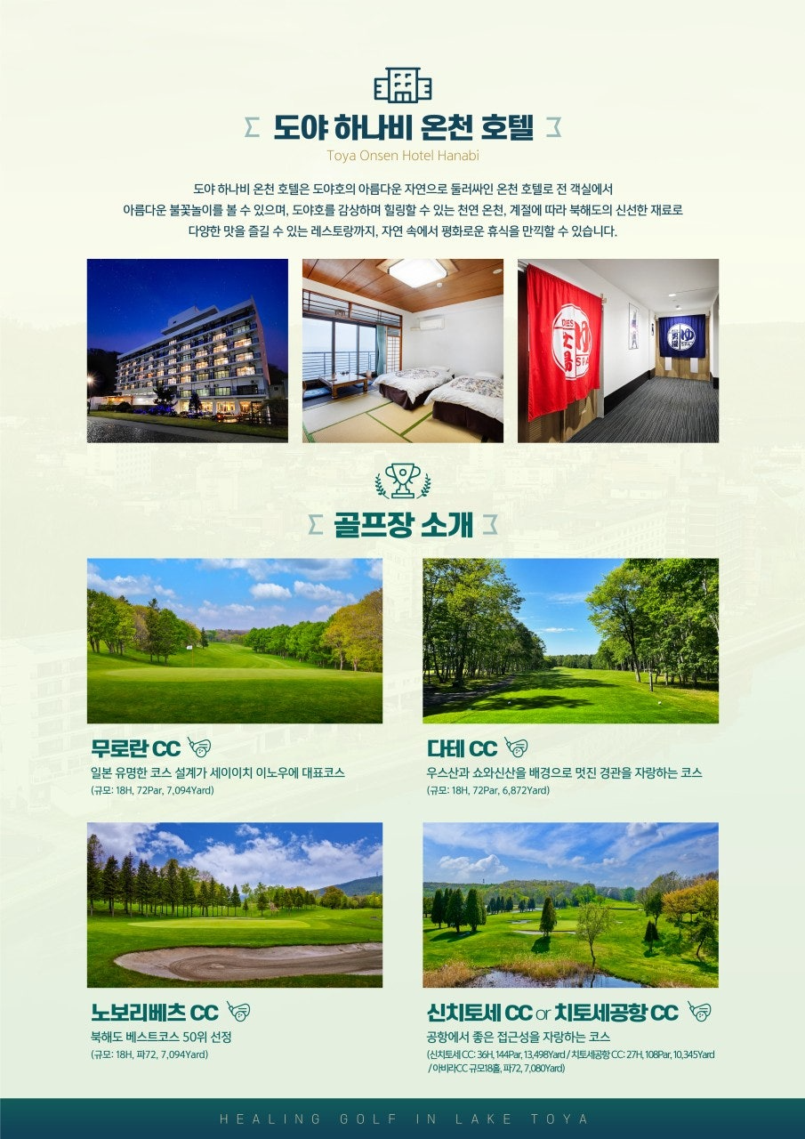 도야호에서 즐기는 골프와 온천 그리고 매일 밤 열리는 불꽃축제까지 힐링과 낭만의 홋카이도 도야호로 지금 예약해서 떠나보세요〰〰🍵