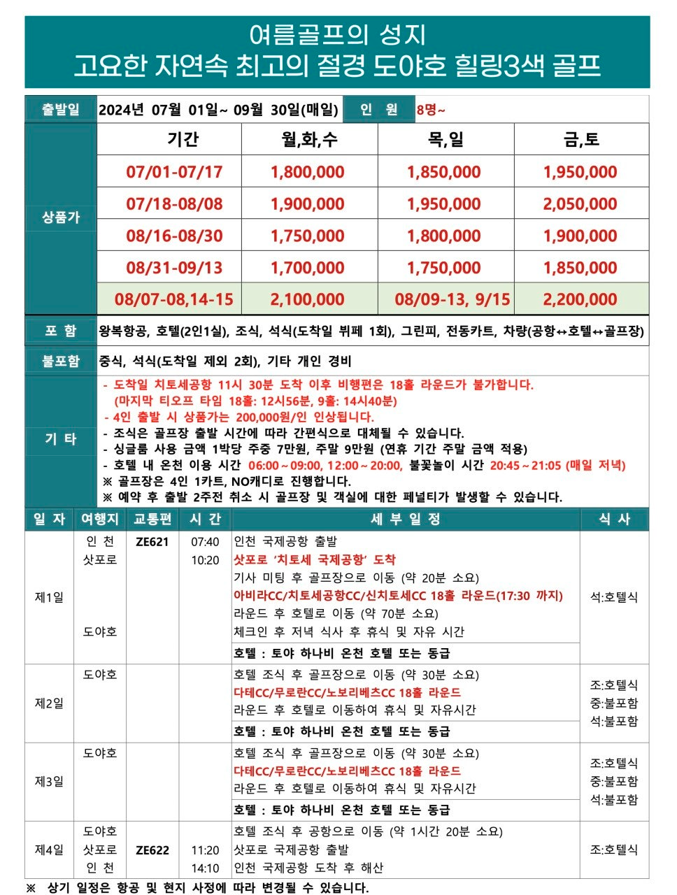 중간일에는 도야호 근처의 다테CC/무로란CC/노보리베츠CC를 배정하며, 도착 당일 또는 마지막날 라운드는 공항 근처의 치토세공항CC/신치토세CC/아비라CC를 배정하여 진행합니다.
