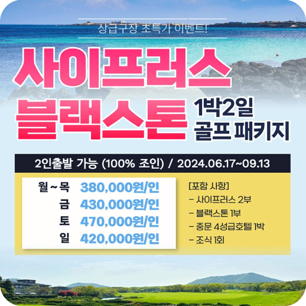 기간: 6/17~9/13까지 매일출발⛳ 1일차 사이프러스 2부 / 2일차 블랙스톤 1부: 사이프러스 대중제 회원제 랜덤배정✔2인 출발 가능 (조인)✔조인 100% 성원✔단체 환영월~목 출발 : 1인 380,000원금 출발 : 1인 430,000원토 출발 : 1인 470,000원일 출발 : 1인 420,000원✔36홀 그린피, 숙박비(중문베니키아호텔), 조식뷔페 포함