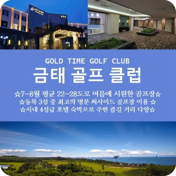 금태(골드타임) 골프 클럽 골프장은 2009년 정식으로 개장하였으며, 발해만의 72만평의 넓은 면적에 전장은 7199야드입니다. 파72홀로 미국의 저명한 설계회사인 Schmidt-Curley사가 맡았으며, 절묘한 원시적 자연생태계와 아름다운 인공미를 완벽하게 조화시킨 해변 링크스풍의 국제대회규격을 갖춘 골프장입니다. 무엇보다도 8만평이상의 벙커와 타잉 그라운드, 페어웨이, 그린이 모두 최고급 잔디인 벤트 그라스를 사용하여 특히 페어웨이에서의 스윙은 끝까지 폴로 스루와 피니시를 하지 않으면 체가 미쳐 빠져나오지 못할수도 있습니다. 한국의 금잔디인 켄터키 블루 그라스와 매우 다른 최고급 골프장입니다.