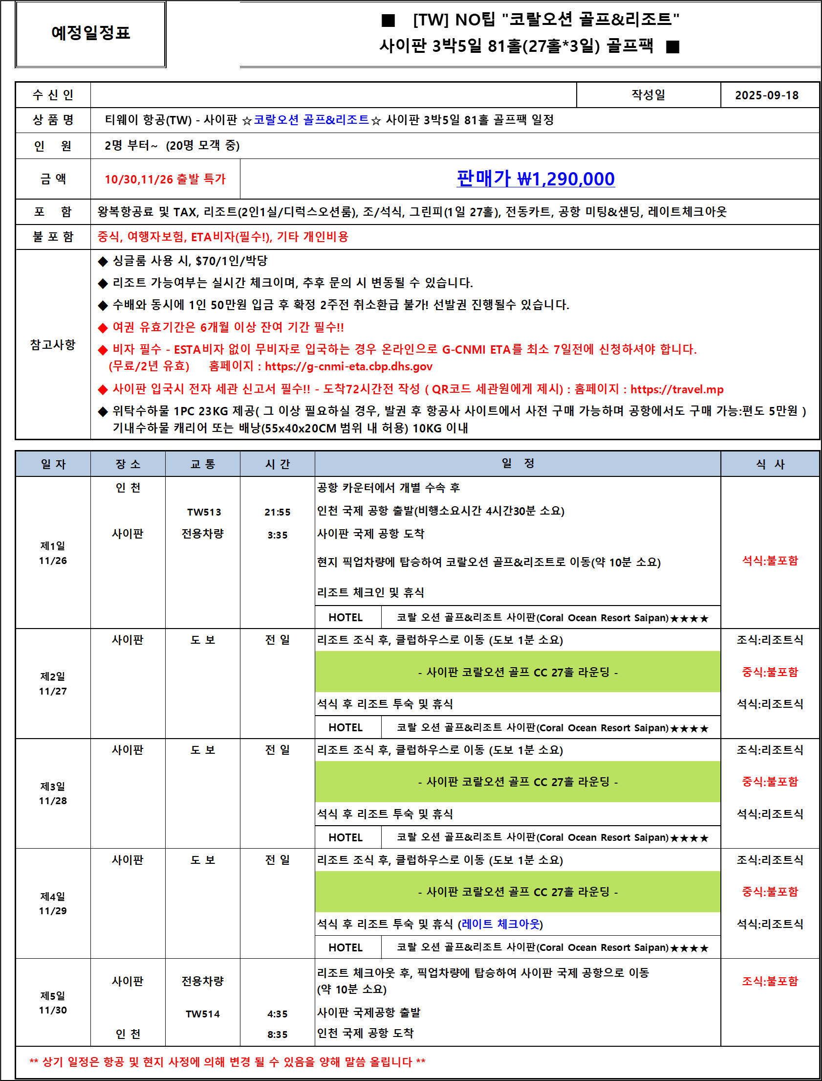 선착순 특가!! 사이판 코랄오션 골프&리조트팩★