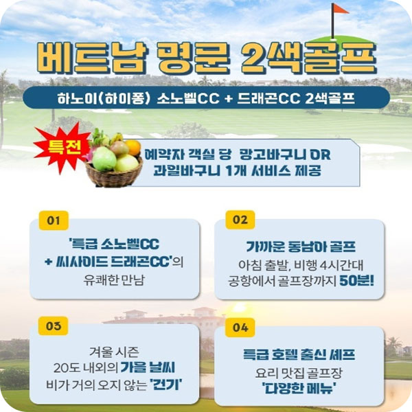 성수기 특정일 지정 날짜 한정 상품이고요. 비에젯항공과 현지 룸과 골프 하드블럭하였습니다. 1회 16명한정, 특가상품 구성하였으며 가성비 만족도 아주 높은 상품입니다. 연말 연초 구정 인기 날짜도 다수 확보 되었습니다. 현재 올해 소노벨cc 150명정도행사진행을하고 있는데 만족도가 좋습니다 많은관심부탁드립니다