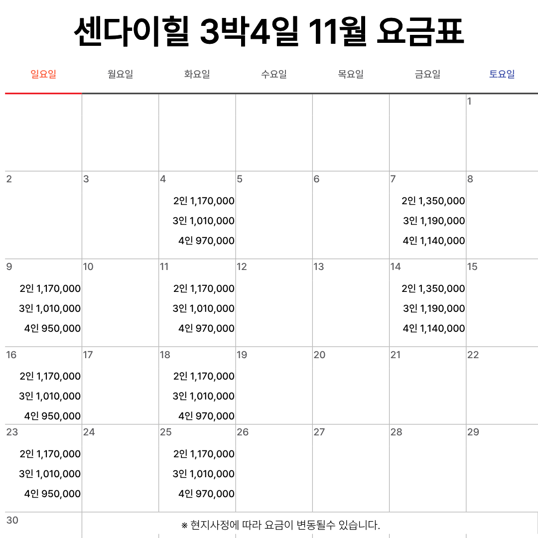 기간 : 9~ 11월 까지 매주 일,화 금 출발